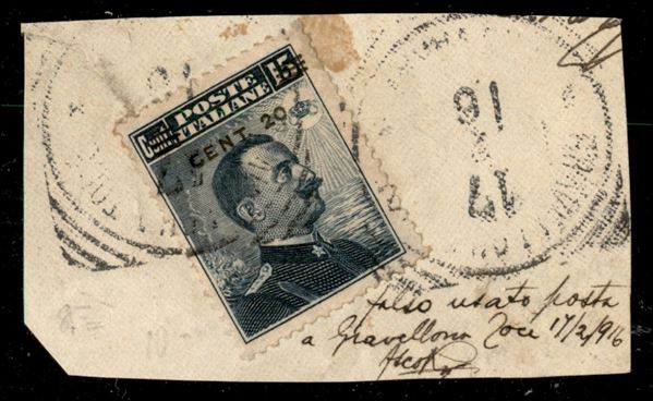 1916 - Falso per Posta - 20 cent su 15 (tipo 106) - usato su frammento (Gravellona Toce 17.2.16) - non catalogato