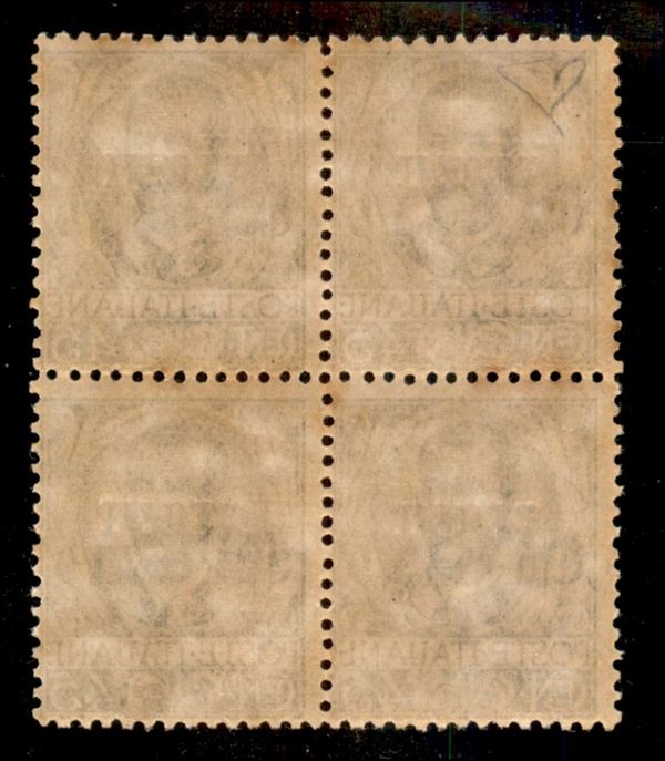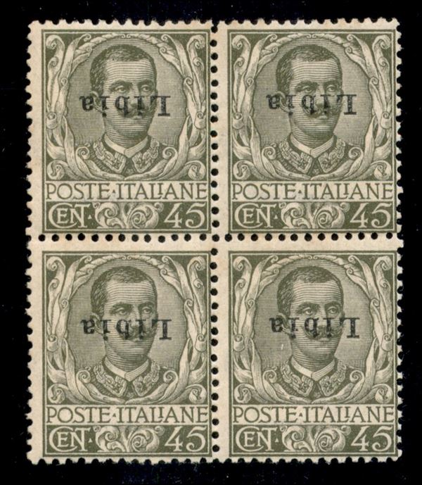 1917 - 45 cent Floreale (18a) - quartina con soprastampe capovolte - gomma integra - Diena + cert. AG
