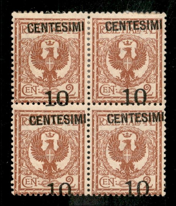 1923/27 - Floreale quartina 10 cent su 2 con soprastampa fortemente spostata in basso - centesimi in alto (138l) - due esemplari con gomma integra