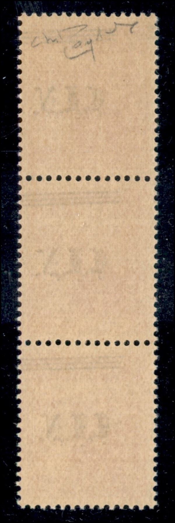 1945 - 20 cent (Unificato 4 - Errani 4b) - striscia di tre con soprastampe a destra - gomma integra - cert. Raybaudi