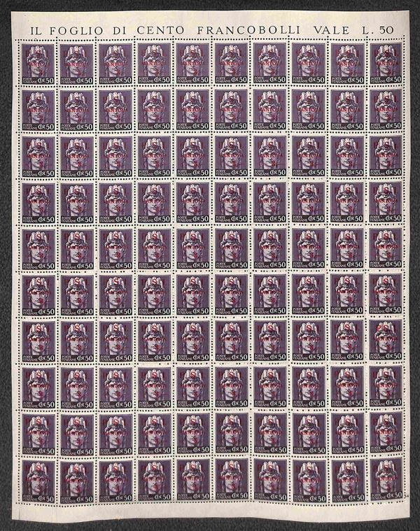 1945 - 50 cent + 3 lire (4) - intero foglio di 100 con tutti gli errori della composizione - gomma integra - notato P con traccia invisibile di punto + S senza punto (pos. 83) - raro insieme