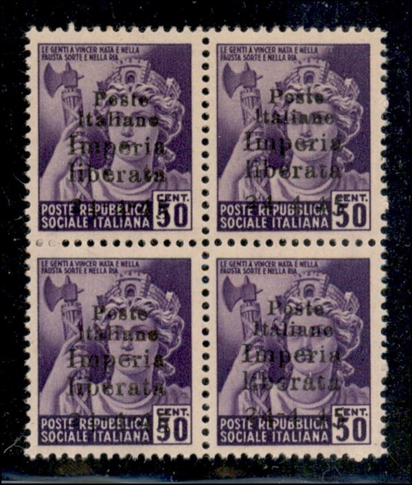 1945 - 50 cent (6e) - quartina con decalco - un pezzo senza trattino dopo 4 (6dc) - gomma integra