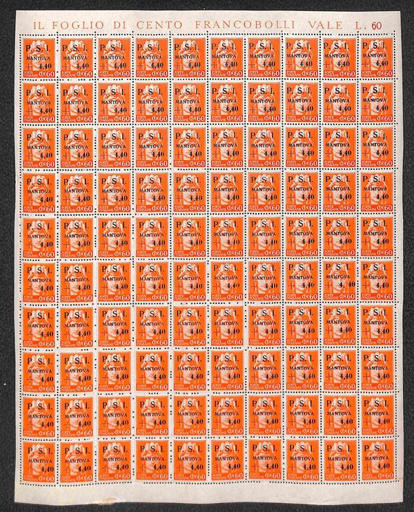 1945 - 60 cent + 4,40 lire (5) - intero foglio di 100 con tutti gli errori e le varietà della composizione (comprese varietà 4 rotto/pos. 8 + y + yh non catalogate) - gomma integra