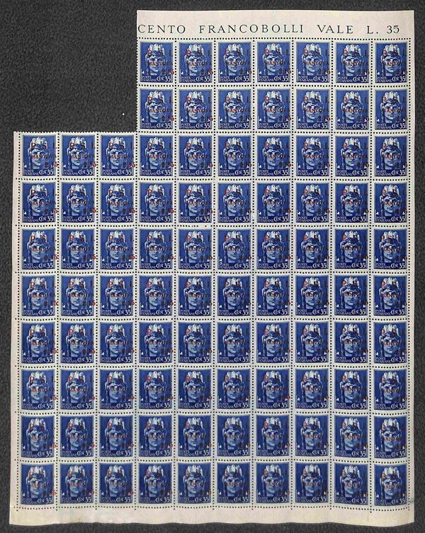 1945 - Blocco di 94 esemplari del 35 cent + 2,15 lire P.S.I. (3fa) con soprastampa spostata a destra - errori di composizione pos. 83 - gomma integra