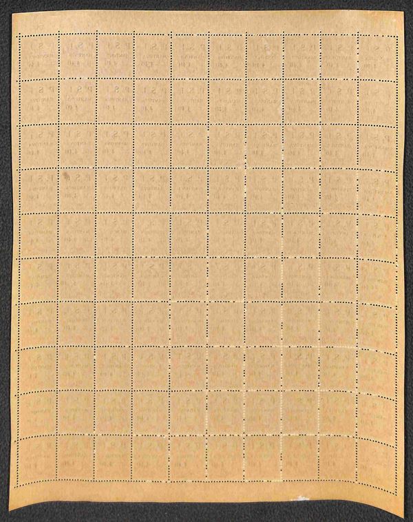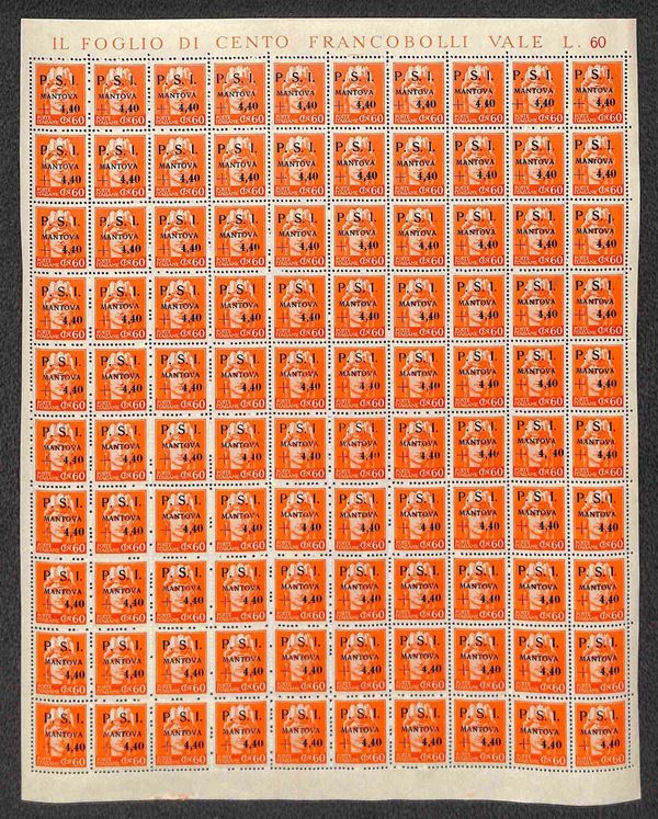 1945 - Foglio intero del 60 cent + 4,40 lire P.S.I. (5) - 100 esemplari con soprastampa obliqua e gli errori di composizione - margini integri - gomma integra