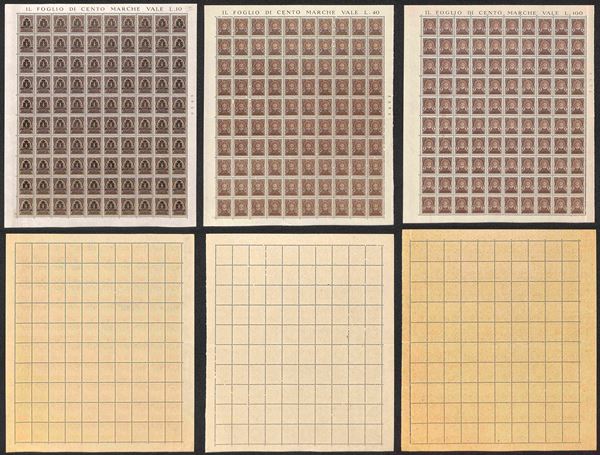 1945/1946 - 40 cent su 10 (1) + 40 cent (2) + 1 lira (3) - 3 valori in fogli di 100 - gomma integra