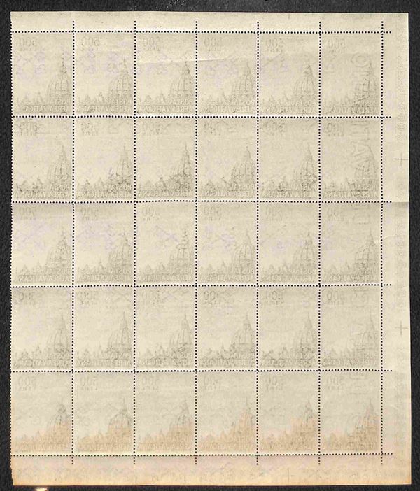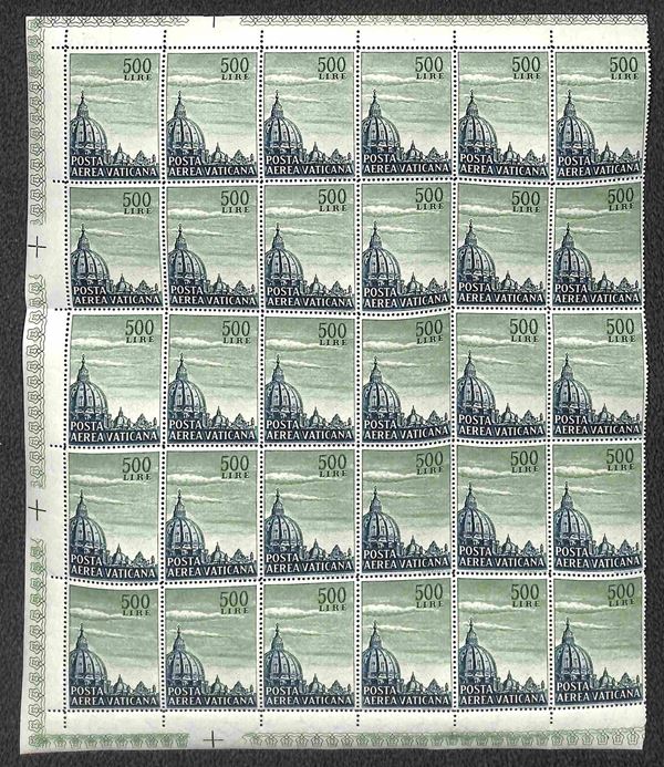 1958 - Blocco angolare di 30 esemplari del 500 lire Cupoloni (33) - intera filigrana lettere 16/10 sulla colonna di 5 di sinistra - gomma integra