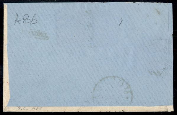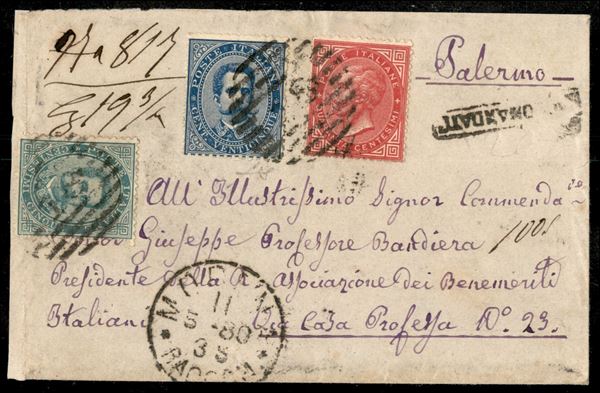 Affrancatura tre colori - 40 cent Vitt. Em. II + 5 cent + 25 cent Umberto I (20 + 37 + 40) su frontespizio di raccomandata due porti da Modena per Palermo del 11.5.80