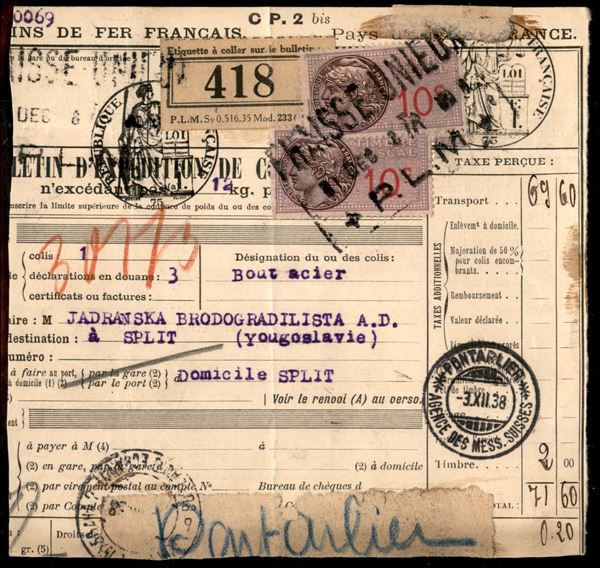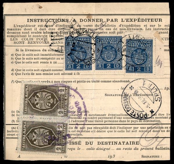 Bollettino Pacchi per la Jugoslavia del dicembre 1938 tassato al retro