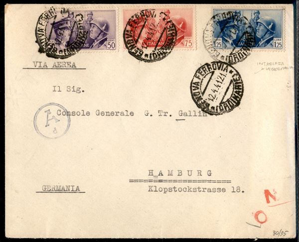 Busta in tariffa affrancata con tre valori Fratellanza d'Armi (455/457) da Genova a Amburgo (Germania) del 12.4.41