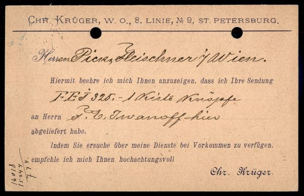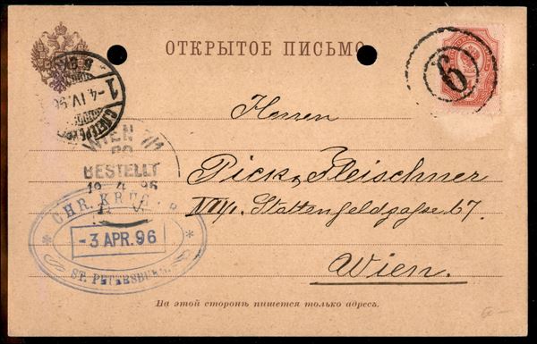 Cartolina postale (4 kop.) da S. Pietroburgo a Vienna del 3.4.96 - fori di registro