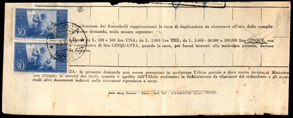 Coppia del 30 lire Costituzione (579) su ricevuta di Modulo Amministrativo Postale - Vignola 3.6.48