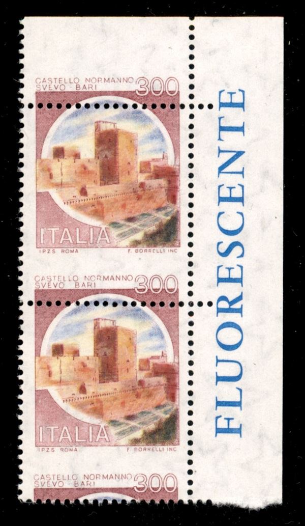 Coppia del 300 lire Castello Normanno (1518) con dentellatura orizzontale spostata (valore sul bordo) - angolo di foglio - gomma integra