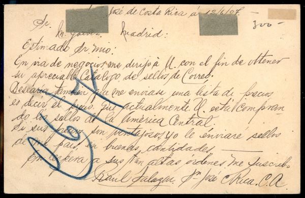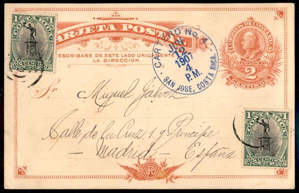Intero postale 2 centimos con affrancatura aggiuntiva (Scott 45) da San Josè a Madrid del 12.6.07 - molto bello
