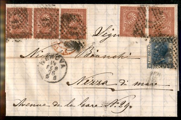 Lettera per la Francia affrancata con striscia di tre + due singoli del 2 cent (15) + 20 cent (26 - difettoso) da Genova per Nizza Marittima del 14 feb. 76