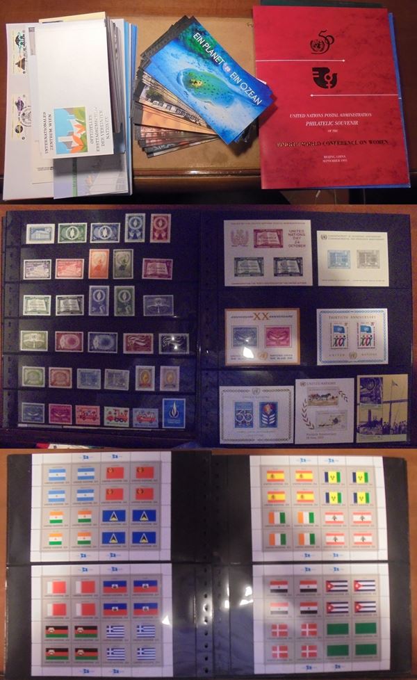 ONU - 1951/2010 - Collezione di valori serie complete foglietti minifogli fogli FDC e storia postale del periodo in 39 pagine di raccoglitore e sciolti in una scatola - presenti NY Ginevra e Vienna - gomma integra usati e lettere