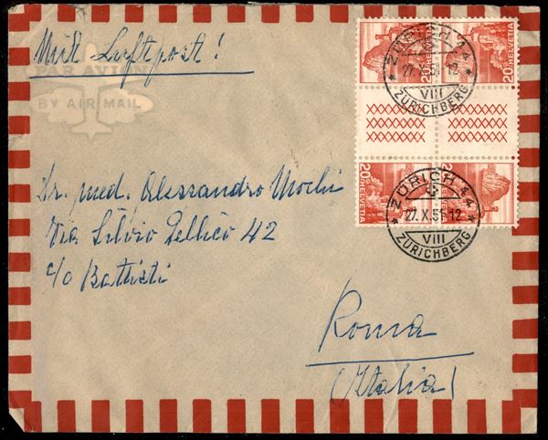 Quartina del 20 cent (502) tete beche con interspazio - aerogramma da Zurigo a Roma del 27.10.51