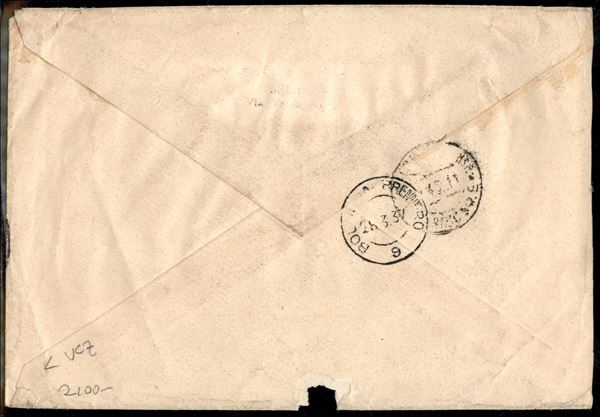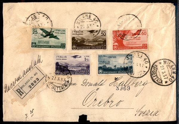 Raccomandata affrancata con serie completa Aerea Bimillenario Oraziano (95/99) da Milano a Orebro (Svezia) del 27.3.37 - destinazione non comune