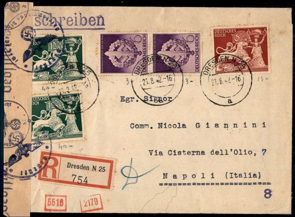 Raccomandata da Dresda a Napoli del 27.8.42 (816 + 817 due + 818 coppia) - censure