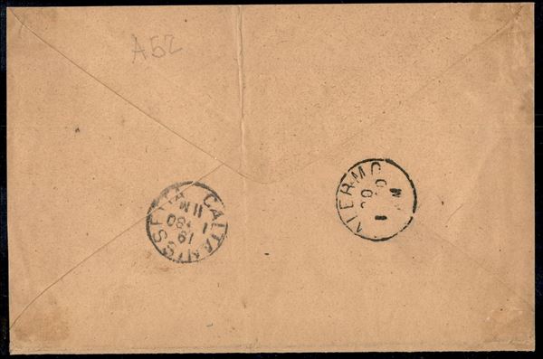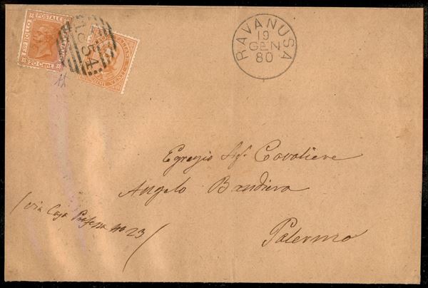 Valori Gemelli - 20 cent Vitt. Em. II + 20 cent Umberto I (28 con dentellatura difettosa + 39) su lettera due porti da Ravanusa per Palermo del 19 gen. 80 - A. Diena