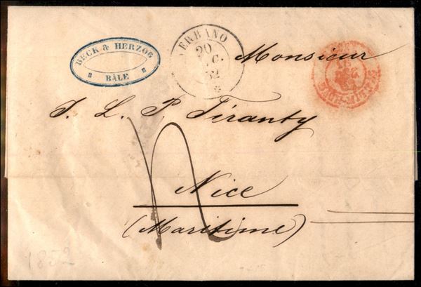 Verbano (P.ti 13) - lettera da Basilea a Nizza del 18.12.1852 - tassata