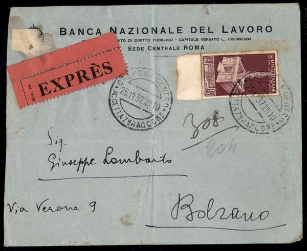 1,75 lire + 1 lira Bimillenario Augusteo (424) - bordo di foglio - isolato su busta espresso da Cremona a Bolzano del 25.12.37 - busta con pieghe d'archivio e ingiallimenti sul valore