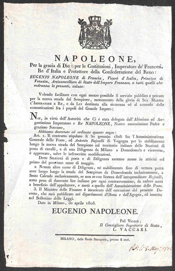 1808 - Decreto di Eugenio Napoleone - Milano - firma e data 8 maggio 1808 in basso a destra