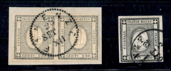 1861 - 1 cent Giornali - un singolo usato (19a) + una coppia orizzontale (19) usata su frammento con firma estesa Giulio Bolaffi + timbrino
