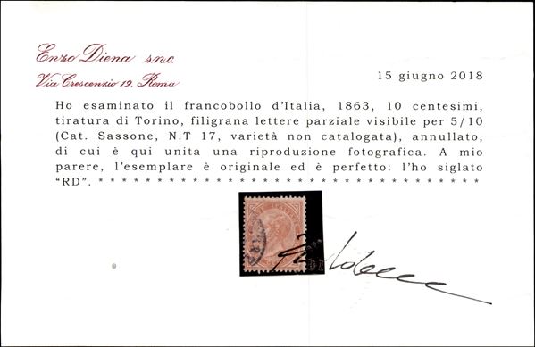 1863 - 10 cent giallo ocra (T17ha) con filigrana lettere 5/10 - usato - cert. Diena