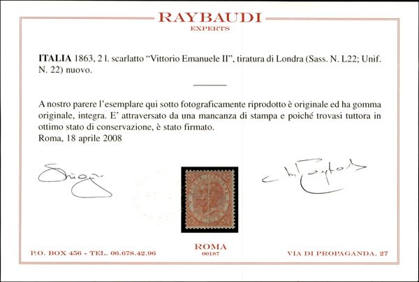 1863 - 2 lire scarlatto DLR (L22) con taglio chirurgico verticale per mancanza di stampa - gomma originale integra - cert. Raybaudi