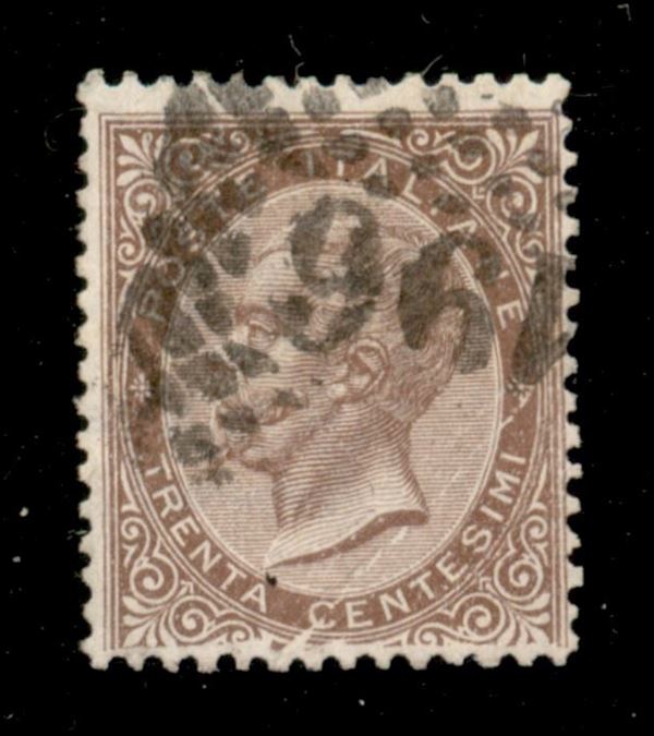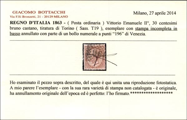 1863 - 30 cent bruno castano (T19) con stampa incompleta in basso - annullo numerale a punti "196" di Venezia - cert. Bottacchi