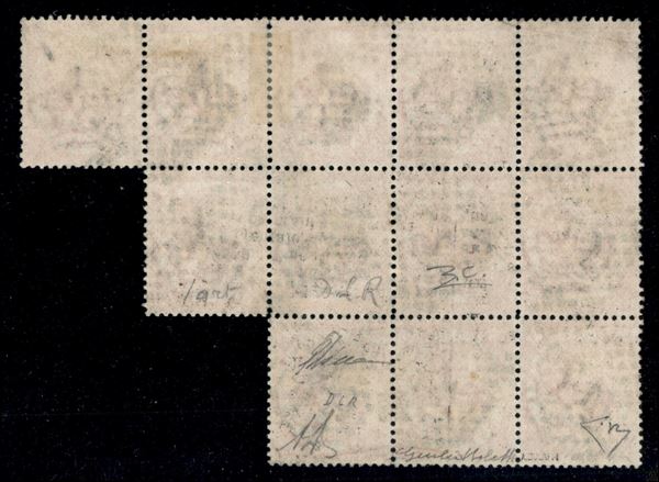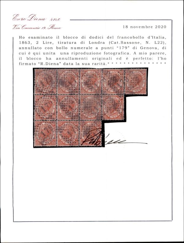 1863 - Blocco del 2 lire DLR (L22) annullato con bollo numerale a punti 179 - uno dei massimi multipli noti di questo valore - rarità - Bolaffi + Diena + cert. Diena