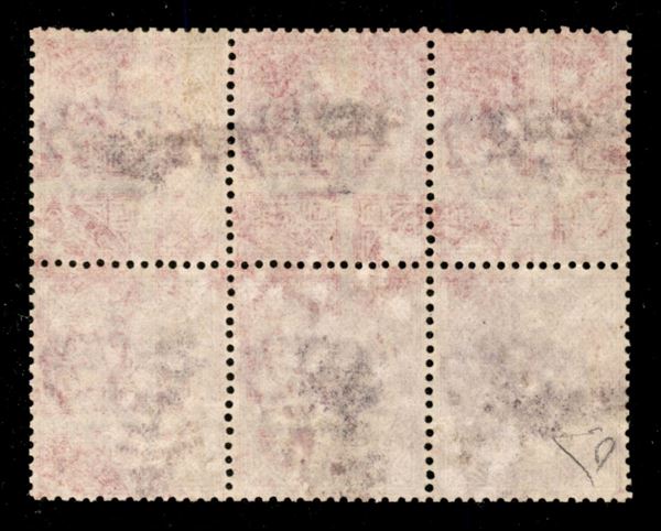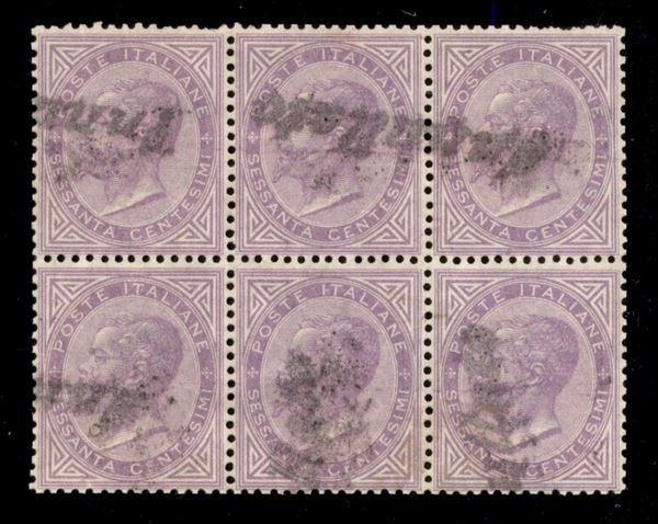 1863 - Blocco di sei del 60 cent lilla (T21) - obliterato con bollo Annullato - cert. Diena
