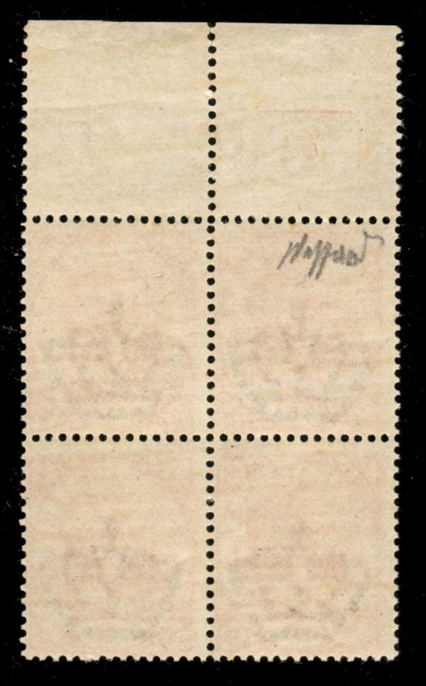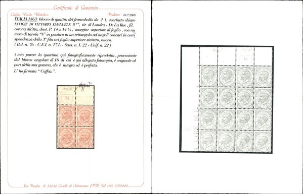 1863 - Quartina del 2 lire scarlatto chiaro (L22) con bordo foglio superiore e numero di Tavola "8" in positivo - gomma originale e integra - cert. Caffaz