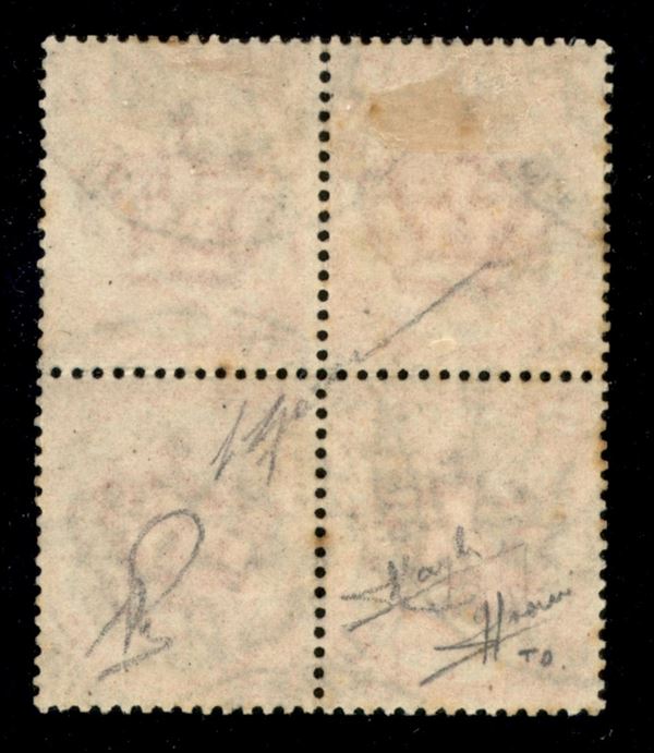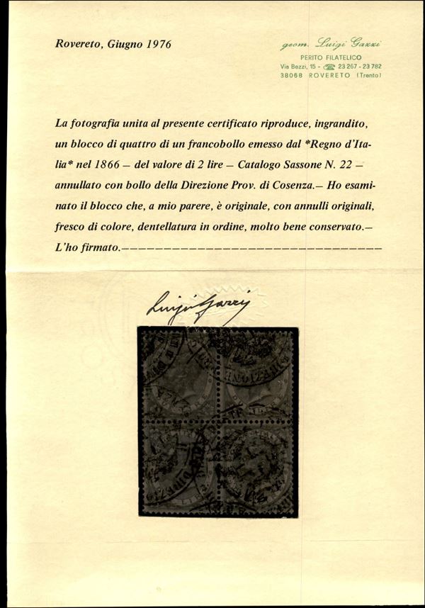 1863 - Quartina del 2 lire scarlatto scuro (T22a) annullata con bollo amministrativo "Direzione Prov.le delle Poste di Cosenza" - cert. Gazzi + Sorani + Raybaudi