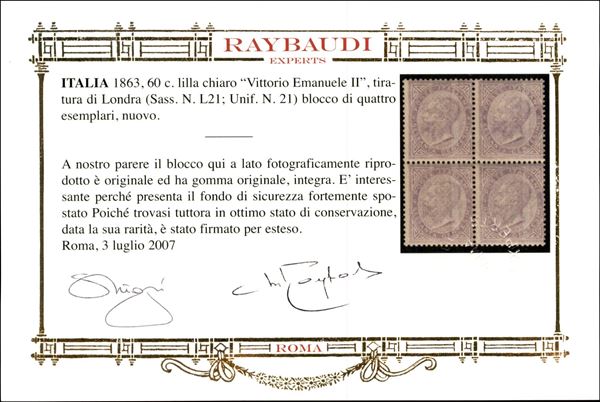 1863 - Quartina del 60 cent DLR (L21) con fondo di sicurezza fortemente spostato a sinistra - gomma originale e integra - cert. oro Raybaudi