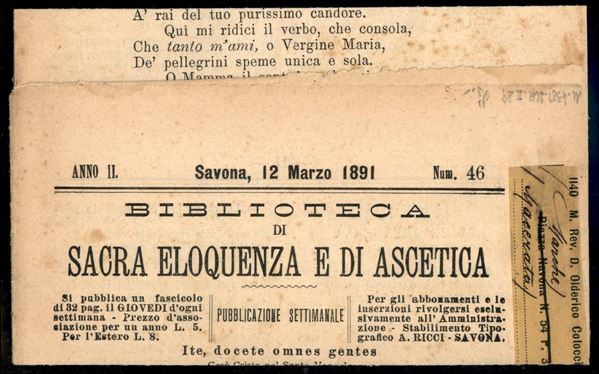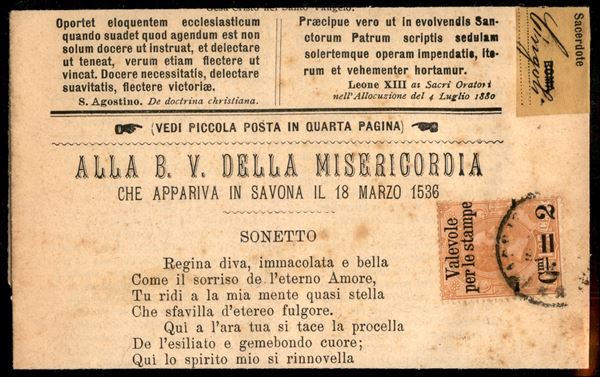 1890 - 2 cent su 1,25 lire (54) usato su foglietto settimanale della "Biblioteca di Sacra Eloquenza e di Ascetica"