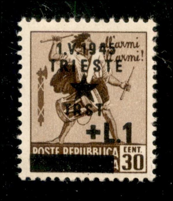 1945 - 1 lira su 30 cent bruno (12) soprastampato sul valore con filigrana - gomma integra