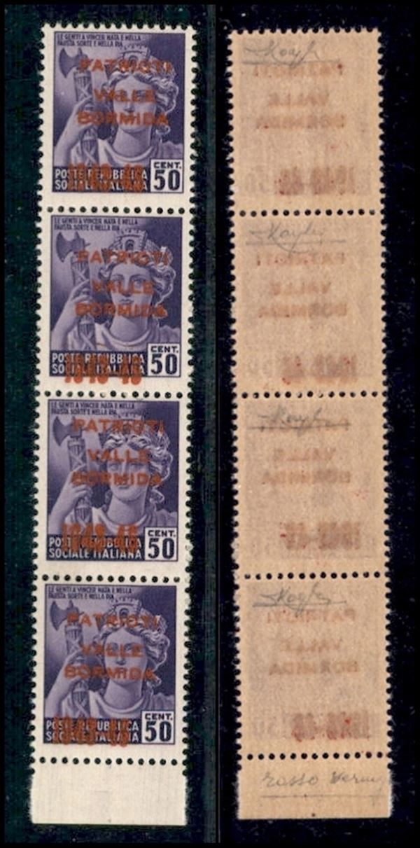 1945 - Soprastampa Vermiglio - 50 cent (5A) - striscia di quattro bordo foglio con soprastampe diversamente spaziate (in verticale/8 - 4 - 8 millimetri) - gomma integra - non catalogato - Raybaudi (2.000++)
