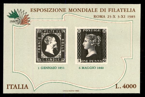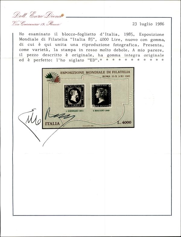 1985 - Foglietto esposizione Italia 85 (BF1) con stampa in rosso molto debole - gomma integra - cert. Diena