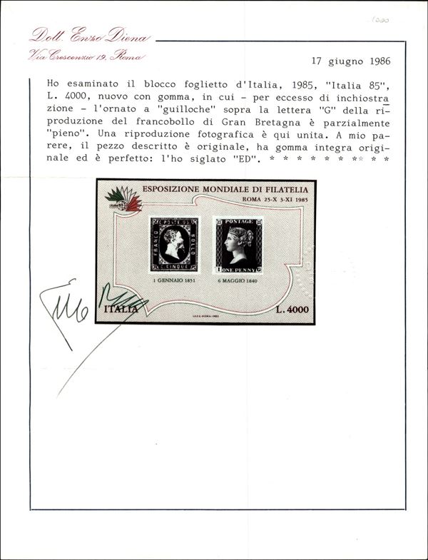1985 - Foglietto esposizione Italia 85 (BF1) con ornato a guilloche sopra la lettera G del francobollo inglese - gomma integra - cert. Diena