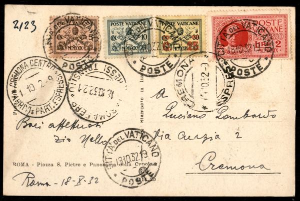 2 lire Espresso (1) + complementari (1 + 2 + 14) su cartolina per Cremona del 18.10.32