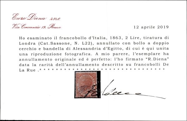 Alessandria d'Egitto (doppio cerchio) su 2 lire DLR (L22) - raro annullamento - cert. Diena