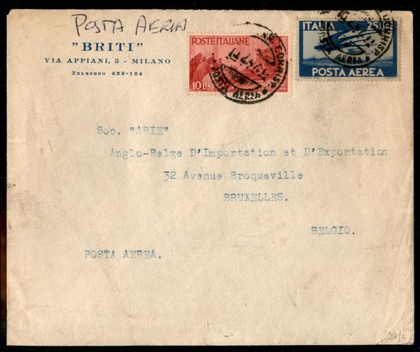 Busta affrancata con 10 lire Repubblica (571) + 25 lire Aerea (131) per via aerea da Milano a Bruxelles