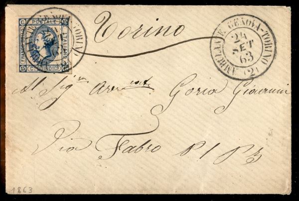 Busta affrancata con 15 cent Litografico (13) annullato con Ambulante Genova - Torino (2) del 24 sett. 63