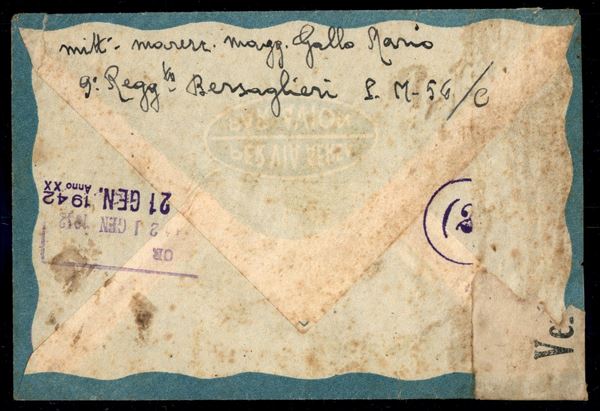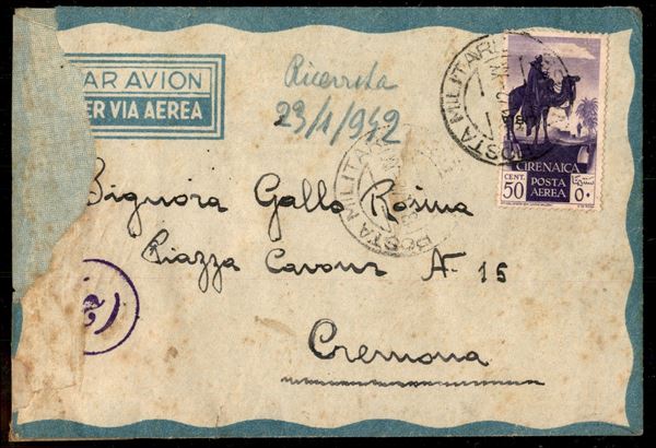 Busta affrancata con 50 cent Posta Aerea (27 tipo b) con soprastampa capovolta e spostata a sinistra da Posta Militare 56 a Cremona del 13.1.42 - busta danneggiata in apertura