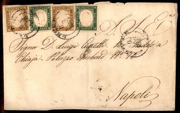 Busta affrancata con due esemplari del 10 cent (1) + due esemplari del 5 cent Sardegna (13E) da Lecce a Napoli del 6.2.63 - dentellatura mancante in basso su un 10 cent