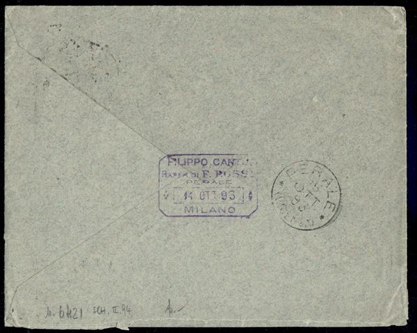 Busta affrancata con tre 20 cent Umberto I (39) da Milano 14.10.93 per Perale