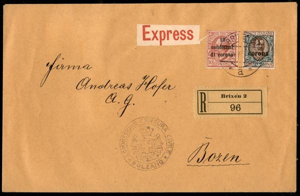 Busta espresso affrancata con 1 corona su 1 lira (11) + 10 cent di corona su 10 cent (4) da Brixen a Bolzano