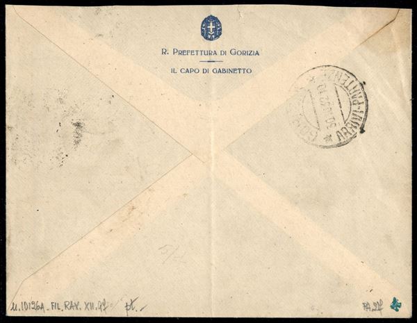 Busta per via aerea affrancata con 1 lira Dante (A27) da Zara Posta Aerea 29.10.32 per Gorizia - sigla Enzo Diena